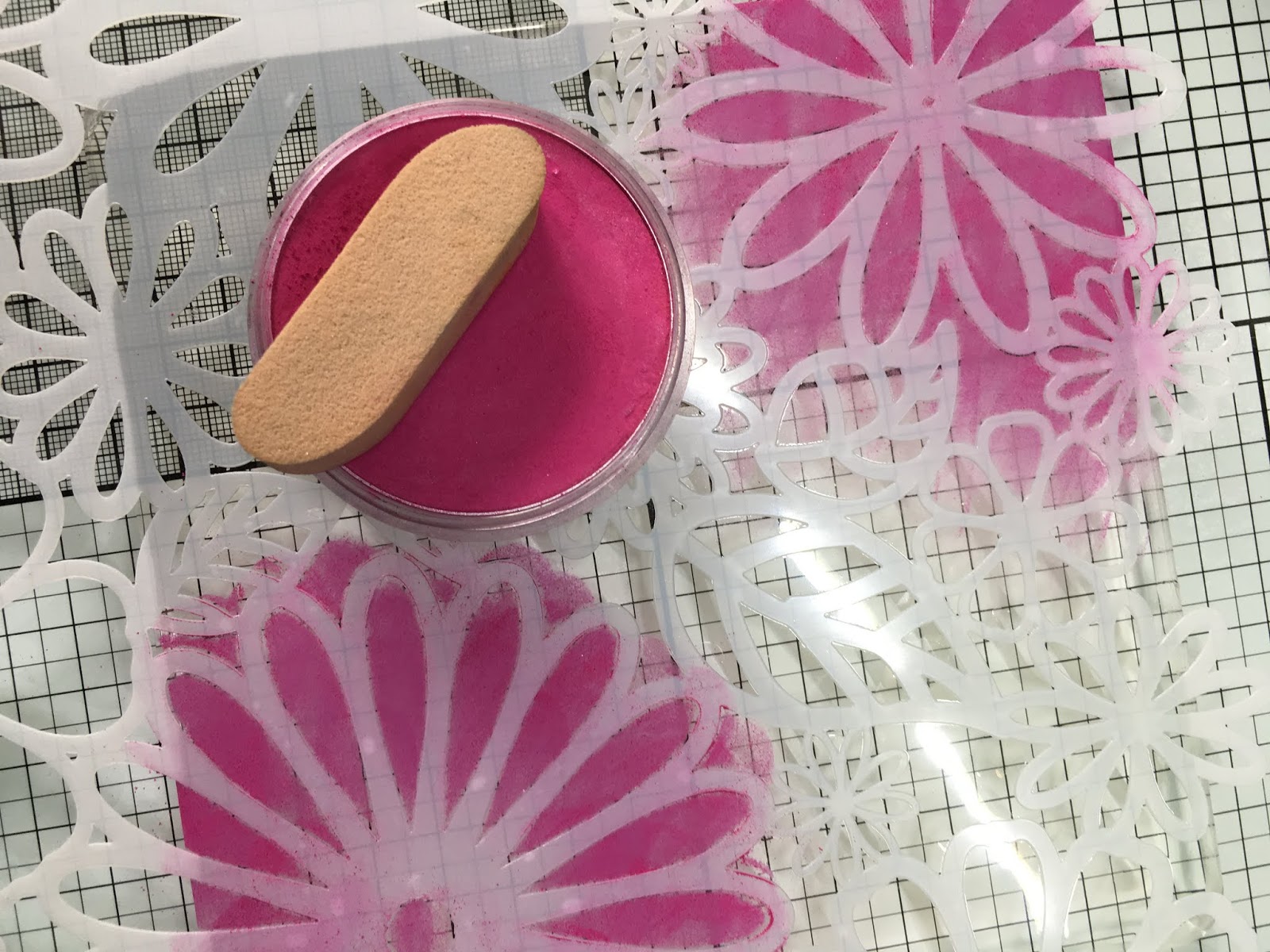 Ook een stencil met bloemetjes doet het erg leuk! Je kunt ook hier weer mee spelen door deze na de eerste print je stencil er weer een slag gedraaid op te leggen. Opnieuw PanPastel aan brengen draaien en daar weer een nieuwe afdruk mee maken.